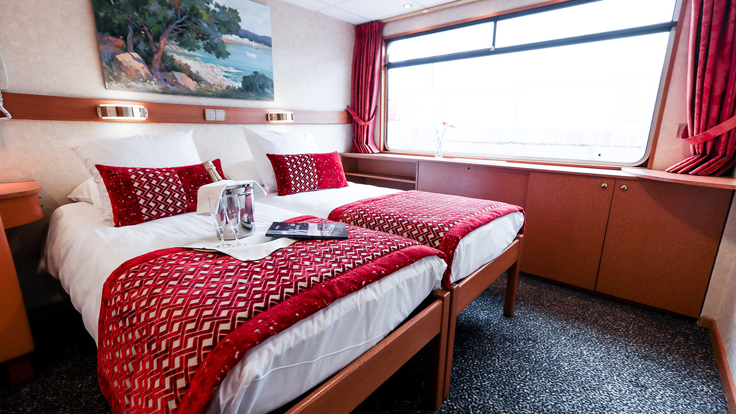 The Rhone Princess has 69 cabins accommodating 138 passengers, and offers an stylish and comfortable cruise experience. The cabins and public areas are all tastefully decorated offering a warm and cosy environment. Enjoy the spacious sundeck where you can enjoy the best views of your river cruise, or unwind with a cocktail in the lounge bar with dancefloor and panoramic views.